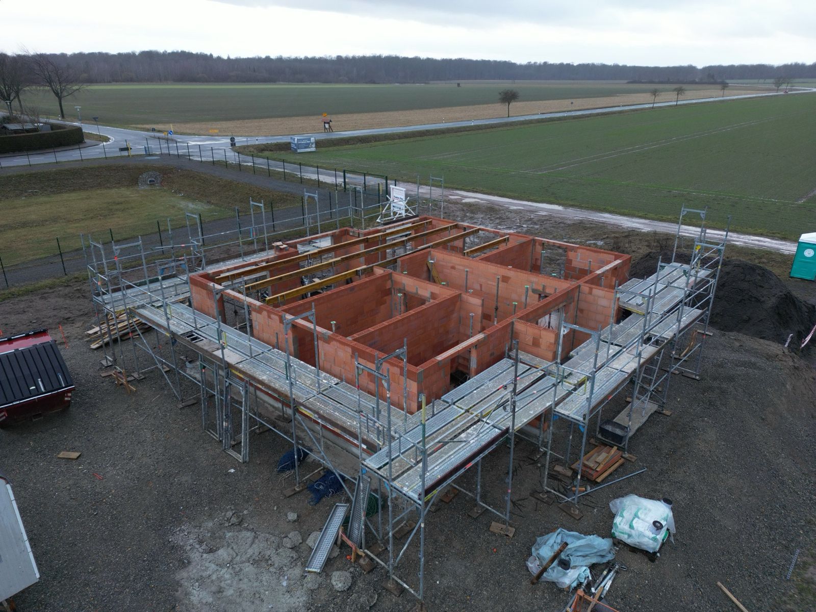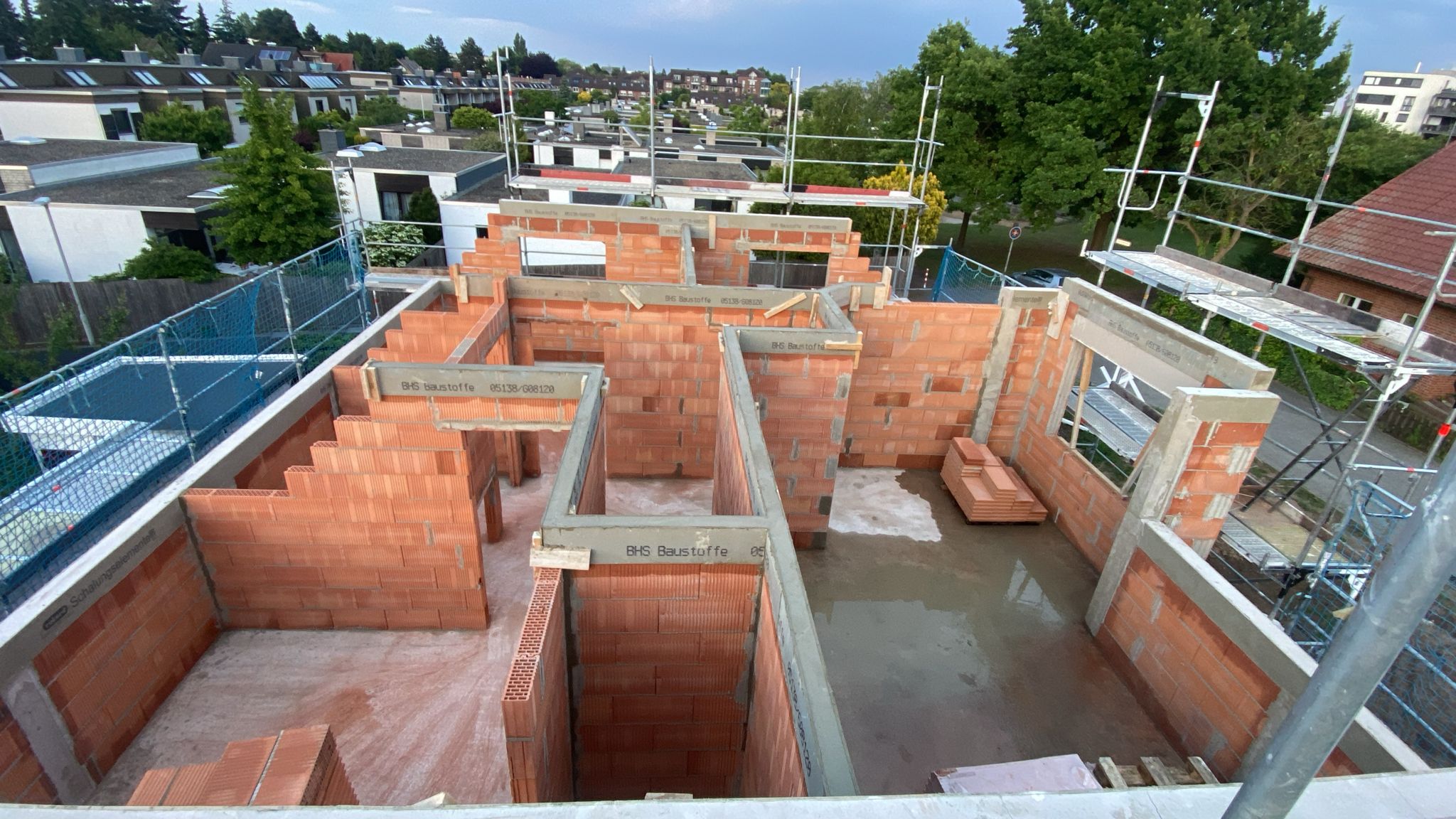 Die Bauarbeiten befinden sich in der Rohbauphase, in der die Grundstruktur des Gebäudes entsteht.