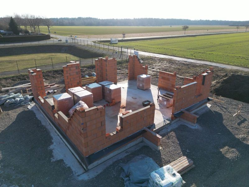 Beim Bau dieses Einfamilienhauses stehen Qualität, Funktionalität und Nachhaltigkeit im Mittelpunkt. Die Aufnahme zeigt einen wichtigen Bauabschnitt, in dem die Grundstruktur des Hauses errichtet wird. Schritt für Schritt entsteht ein modernes Zuhause mit langlebiger Bauweise.